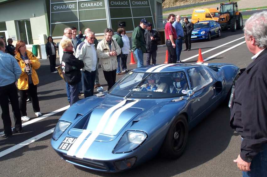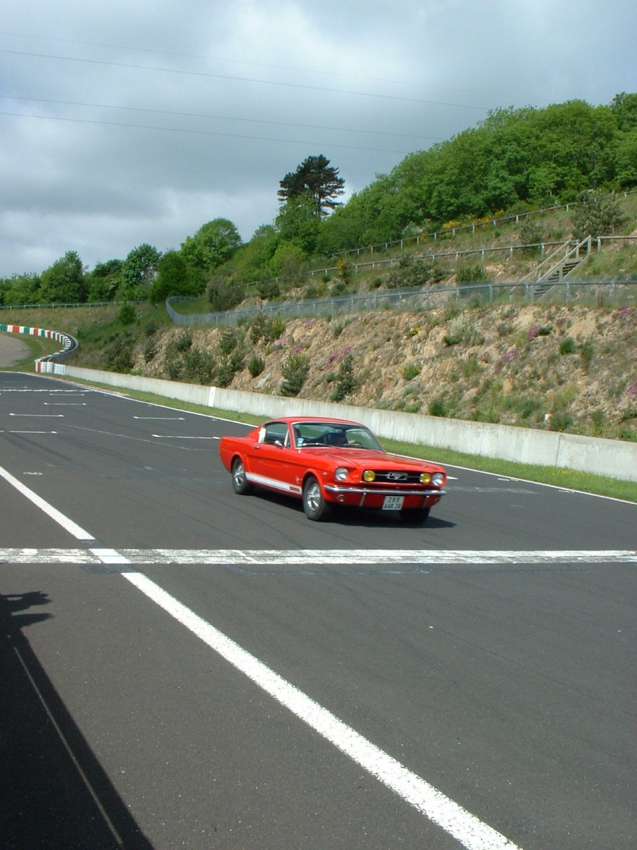 prendre le départ vers 8h30, certains avec du retard (pas de réveil..). Sur le parking du circuit (nous ne pourrons pas y tourner, le circuit étant réservé par le Mustang Club) le vent souffle fort mais il y a du soleil donc je décapote.. J'ouvre le jeu des "quilles" où il faut faire tomber une quille mais pas les deux. Les spectateurs me regardent béatement faire tomber .. les 2 quilles ! Et quand je demande où j'en suis on me dit "c'est bon , les deux sont tombées...". Suivent ensuite les autres voitures qui elles ont plus de chance (ou plus de conseils..). Vers 11h30 on quitte Charade pour les Monts d'Auvergne et la région de La Bourboule /