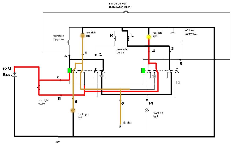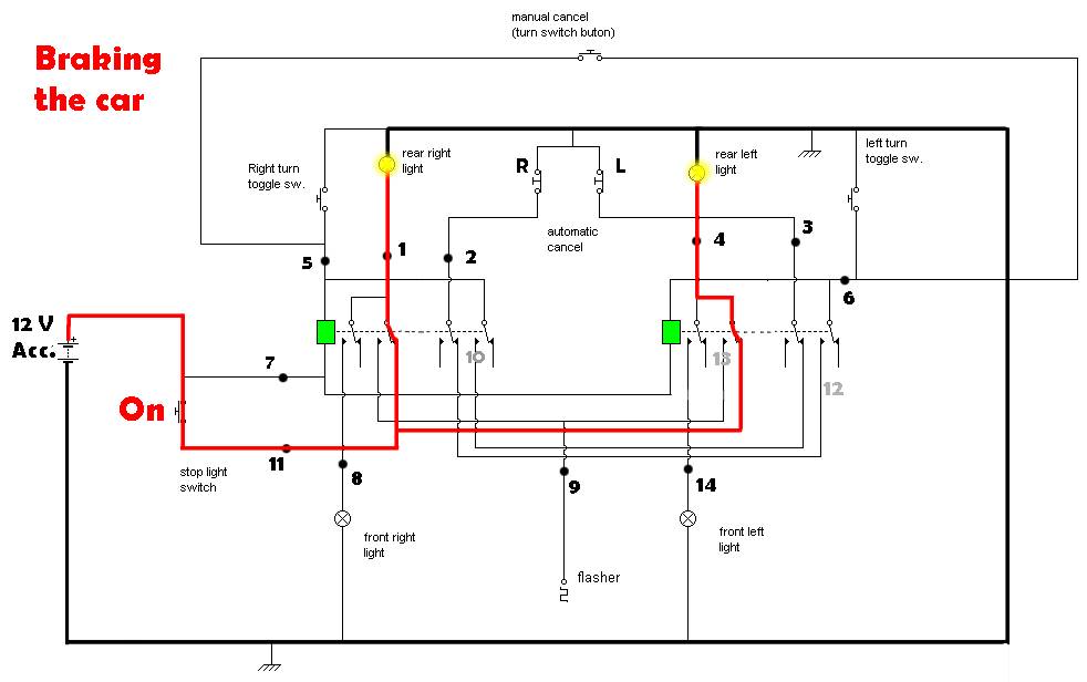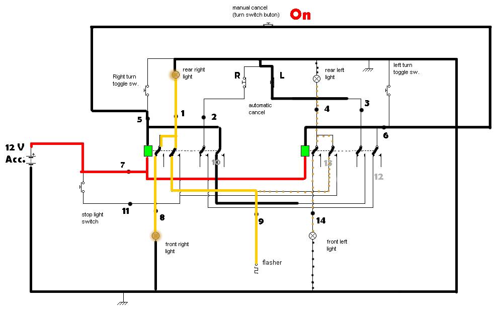 3rd shematic : canceling the turn with the manual cancel switch When you push the cancel switch you actuate the left relay (the relay is grounded via the cancel switch and the terminal # 5). So the ground line through the L automatic cancel, the # 3 and #10 terminals is opened. The right relay coil has its circuit and in the same time ther's no ground on the #5 terminal so the left relay opens also (even if you rest on the cancel button). Depending condition you could have one blinking of the 4 lights in a fraction of second.. It's difficult to show all these facts on a whole drawing !! Below i draw the system at the point just after i push the cancel button and before the two relays go off.