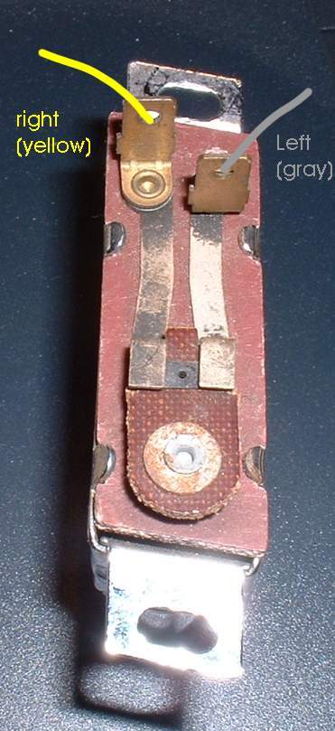 How works the '57-59 turn signal system on Imperial ? If you look at a '57, '58 or '59 Imperial ther's something different from the other Mopar of the same year : ther's no turn signal lever on the steering column ! The turn signals are actuated with a switch at the bottom of the Torqueflite controls pushbuttons. The switch is a "on - off - on" push affair on '57 cars (at the top : right turn - at the bottom : left turn - in the middle : canceling) and a much ergonomic toggle switch with a small canceling button on '58 and '59 cars. As there's no contact plate on the steering shaft the Chrysler engeneers had to imagine a special "automatic canceling switch" on the steering tube. This part (1770 498) has a small plastic pin actuated by the movement of the steering tube. The pin is often broken and then you haven't automatic canceling.