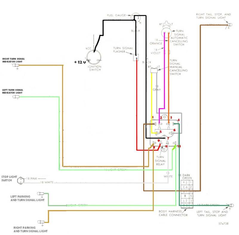 Here is the schematic of the turn signal circuit (scaned on the '57 FSM). I've colored the wires according to their real colors.
